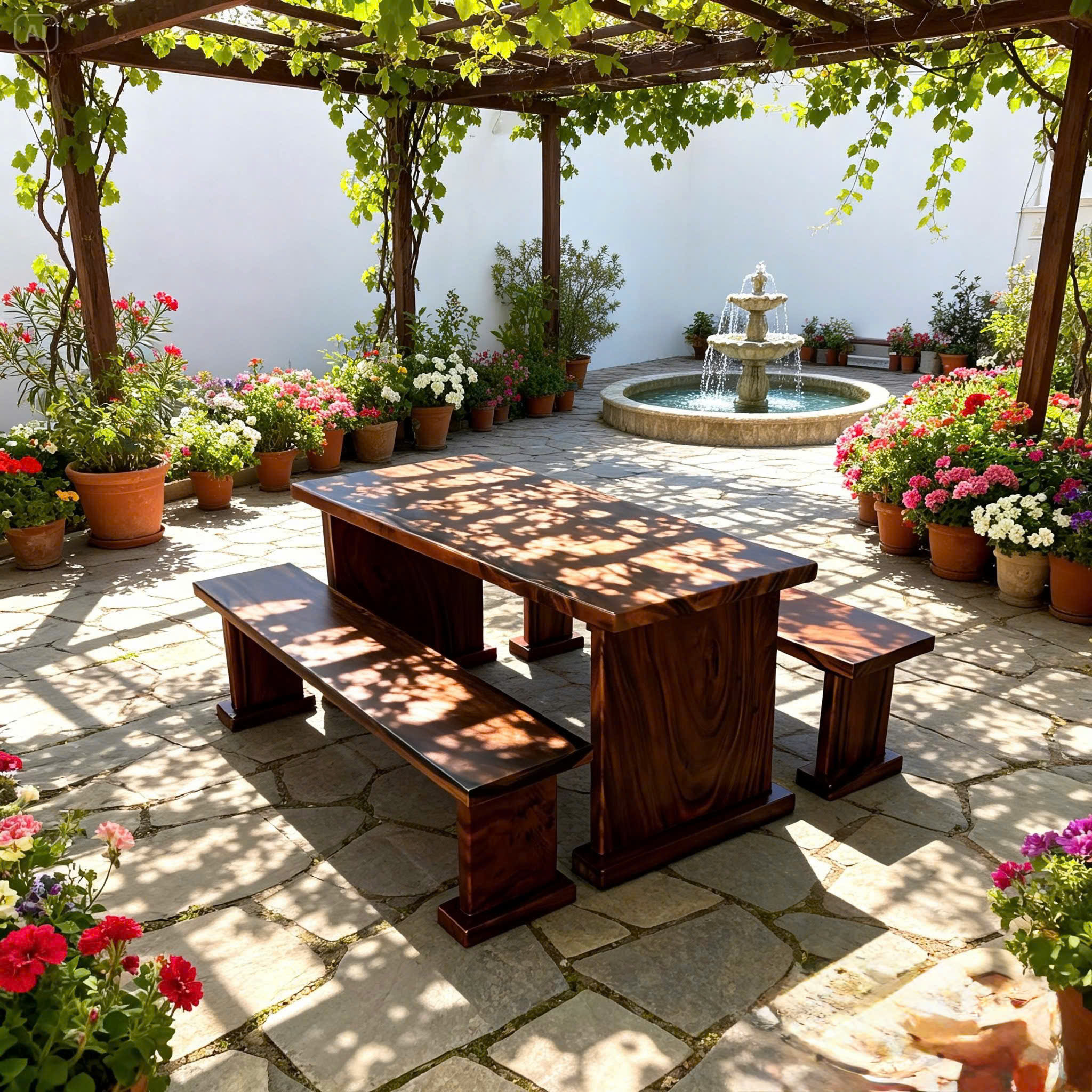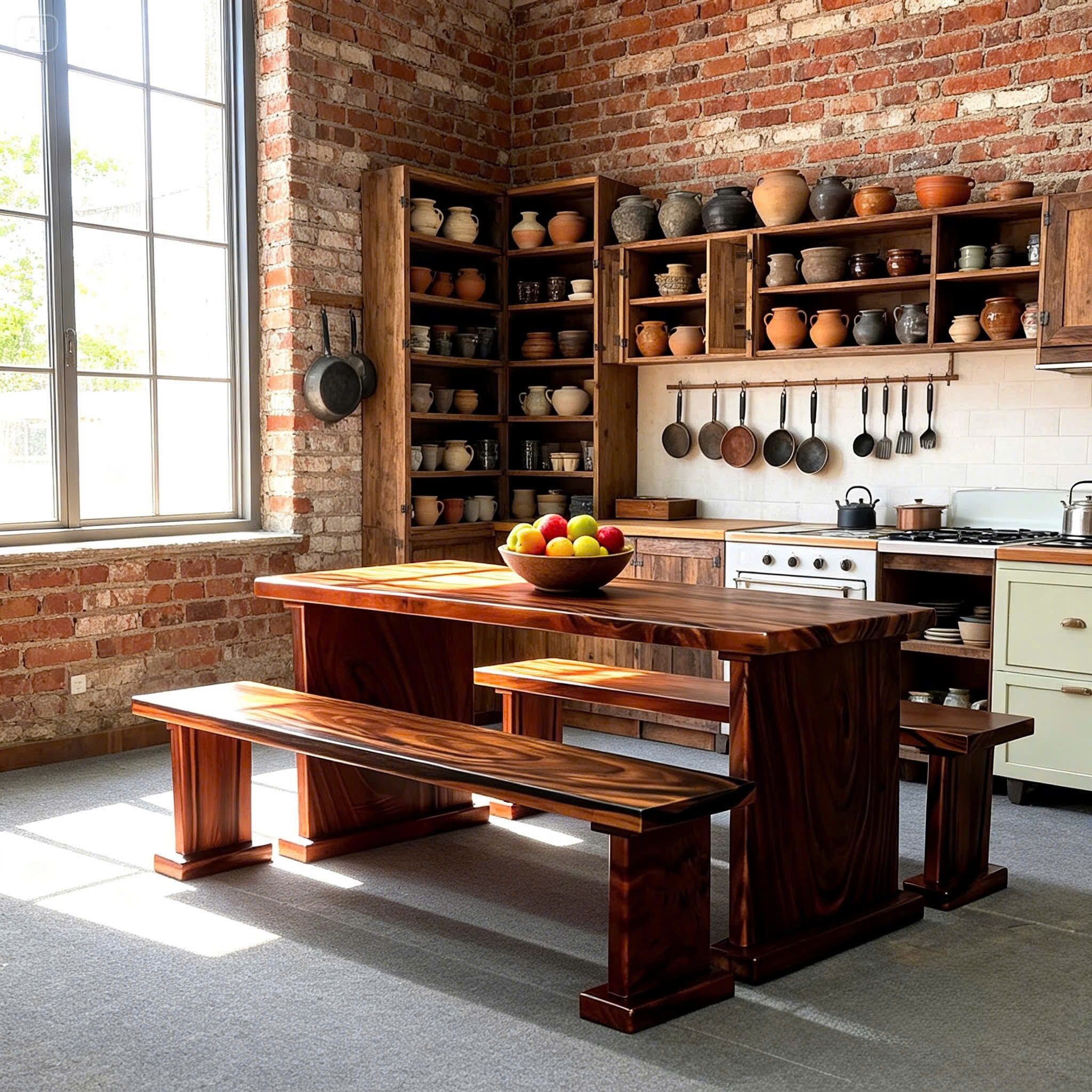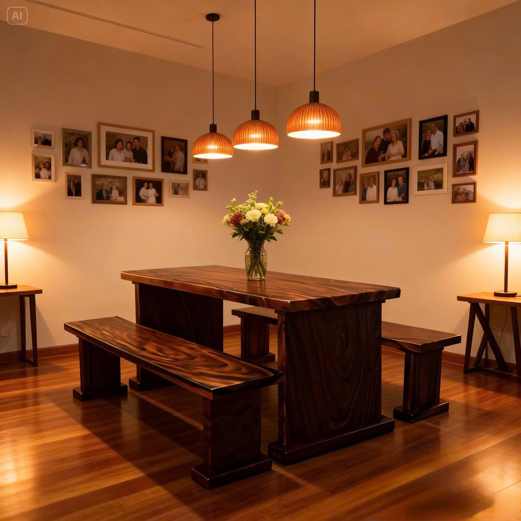 Mặt bàn gỗ me tây nguyên khối dày 5cm, vân gỗ tự nhiên nổi bật, màu gỗ ấm, càng sử dụng càng đẹp. Bộ gồm 1 bàn + 2 băng gỗ, ngồi thoải mái nhiều người, tiết kiệm diện tích và rất gọn gàng.